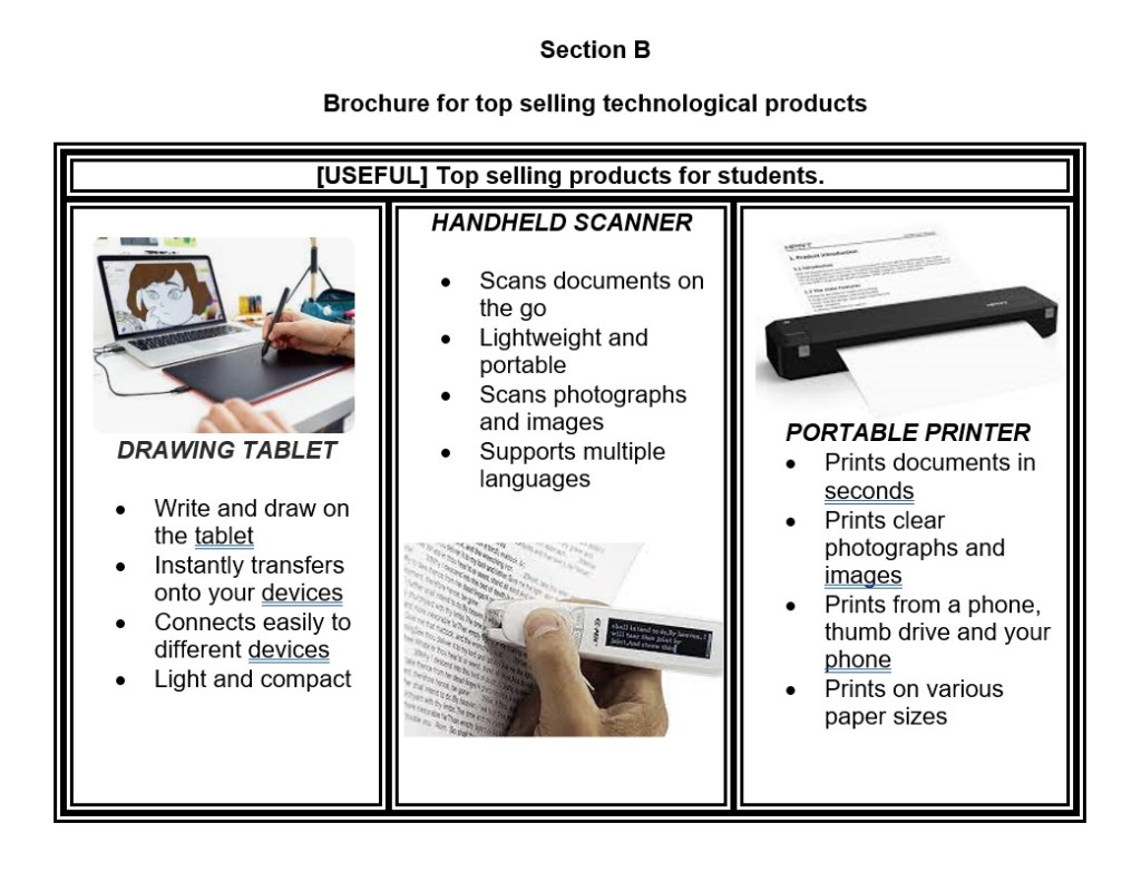 After looking at the brochure, I think the most suitable product would be the Handheld Scanner. Though the other products are definitely eye-opening, the Handheld Scanner is capable of scanning pictures as well as supporting a variety of languages. Not only that, but it is also small and lightweight, so I can easily store it in places such as my pocket or pencil case.