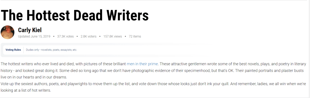 Intrigued by the title? Click here to head to the site to see if you agree whether these male writers are indeed the hottest (dead) ones!